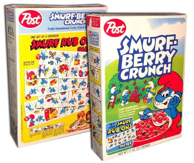 Smurf-Berry Crunch was a cereal launched by Post Consumer Brands in the 1980s, riding the wave of popularity from The Smurfs animated series. The cereal featured a blend of sweetened corn, oat, and wheat flakes, along with colorful berry-flavored pieces shaped like the beloved blue characters. Its vibrant colors and fruity taste made it a hit among children, turning breakfast into a fun and flavorful experience. Although Smurf-Berry Crunch was eventually discontinued, it remains a fond memory for many who grew up in the ’80s.