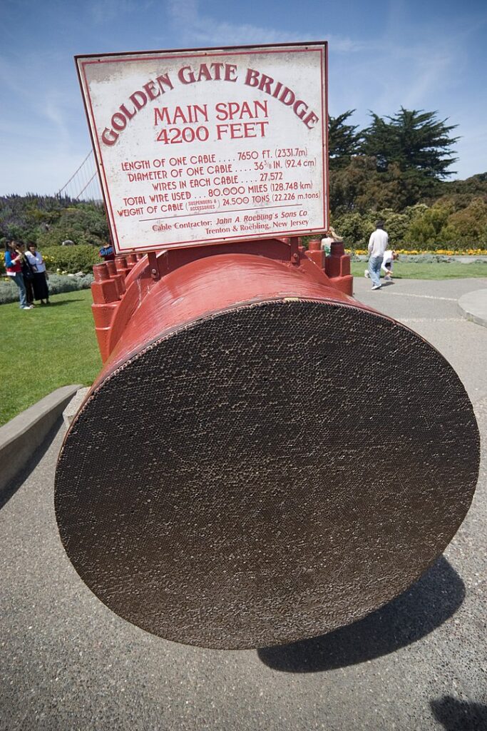 The Golden Gate Bridge’s two main cables, manufactured by the Roebling Company, are among the longest and strongest in the world. Comprising over 27,000 individual wires, the cables were meticulously spun on-site, ensuring they could support the weight of the bridge and endure intense environmental stresses.